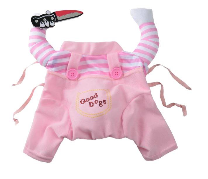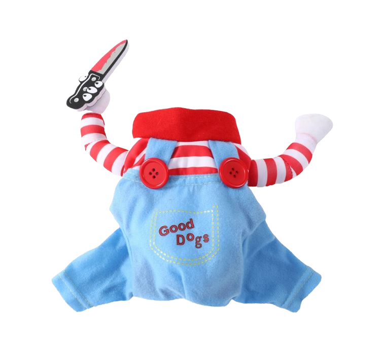 Unleash your pup’s wicked sense of humor this Halloween with the "Good Dogs Gone Bad" costume. This funny and spooky outfit features a red-and-white striped shirt, bright blue overalls with "Good Dogs" stitched on the front, and two cute stuffed arms, one of which holds a silly toy knife. The plush knife and over-the-top design make it look like your dog is a tiny terror on the loose.