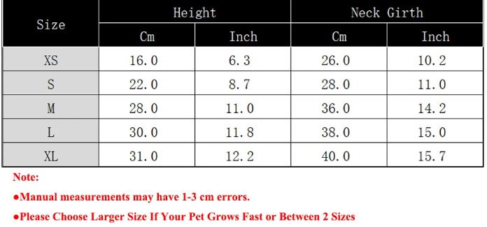 XS: Height: 16CM / 6.3 inch;Neck Girth (without rope): 26CM / 10.2 inch